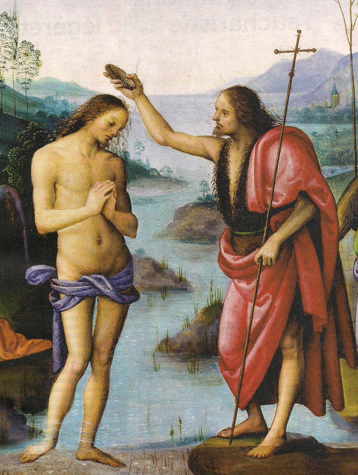La scène baigne dans une lumière cristalline d’aurore sur laquelle tranchent les coloris raffinés : rouge groseille, bleu lavande, turquoise, gris perle… Le Jourdain serpente à travers une campagne nappée de brume et s’étend jusqu’à l’horizon lointain et bleuté. Les arbres grêles, au feuillage peu fourni comme des frênes au printemps, font réellement reconnaître le Pérugin.